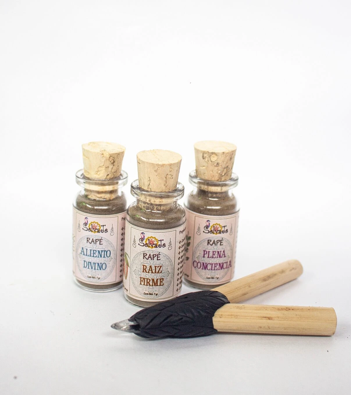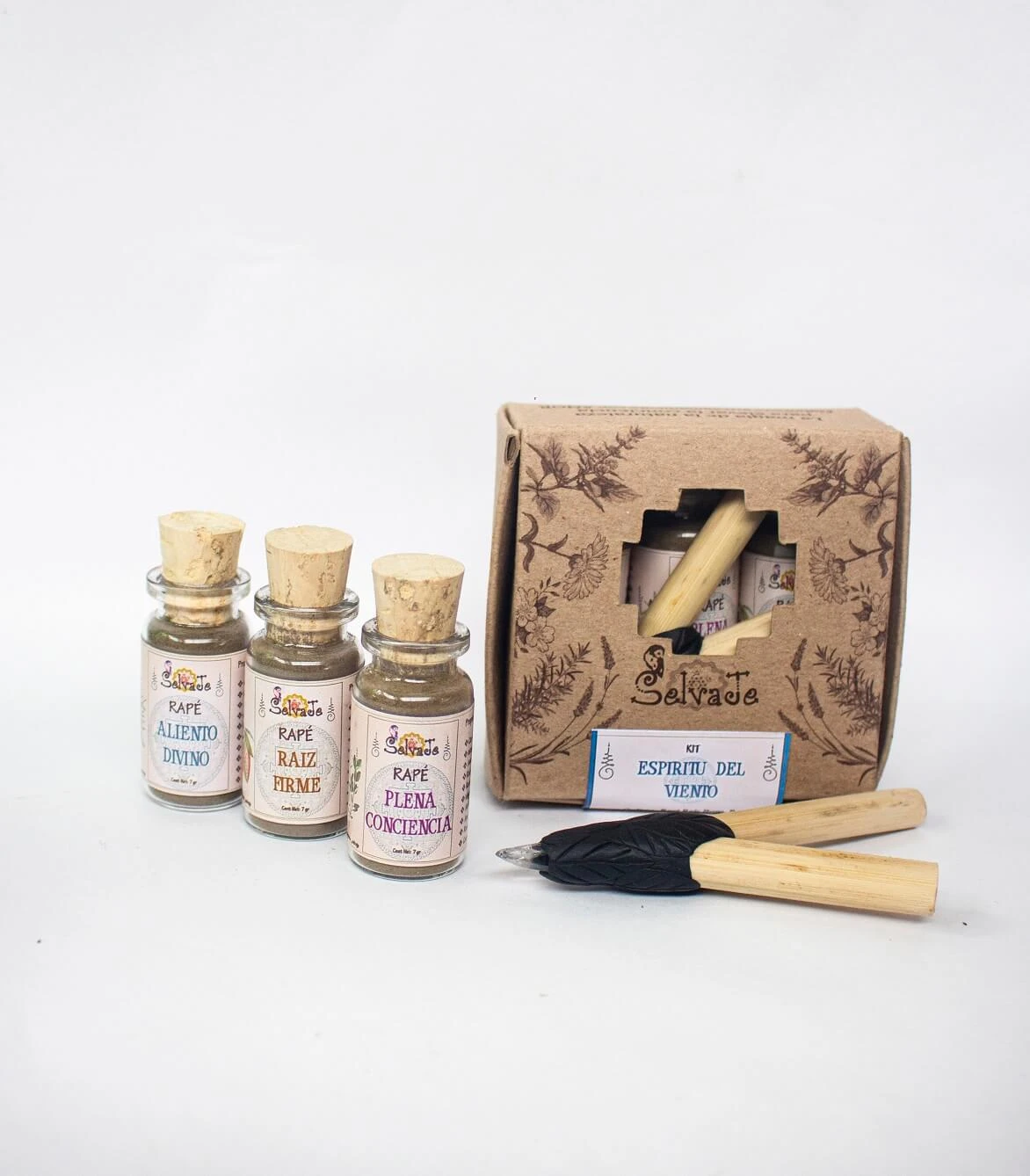 Este kit contiene: 1 Rapé Plena Conciencia 7gr, 1 Rapé Aliento Divino 7gr, 1 Rapé Raíz Firme 7gr y un Autoaplicador (Kuripe).