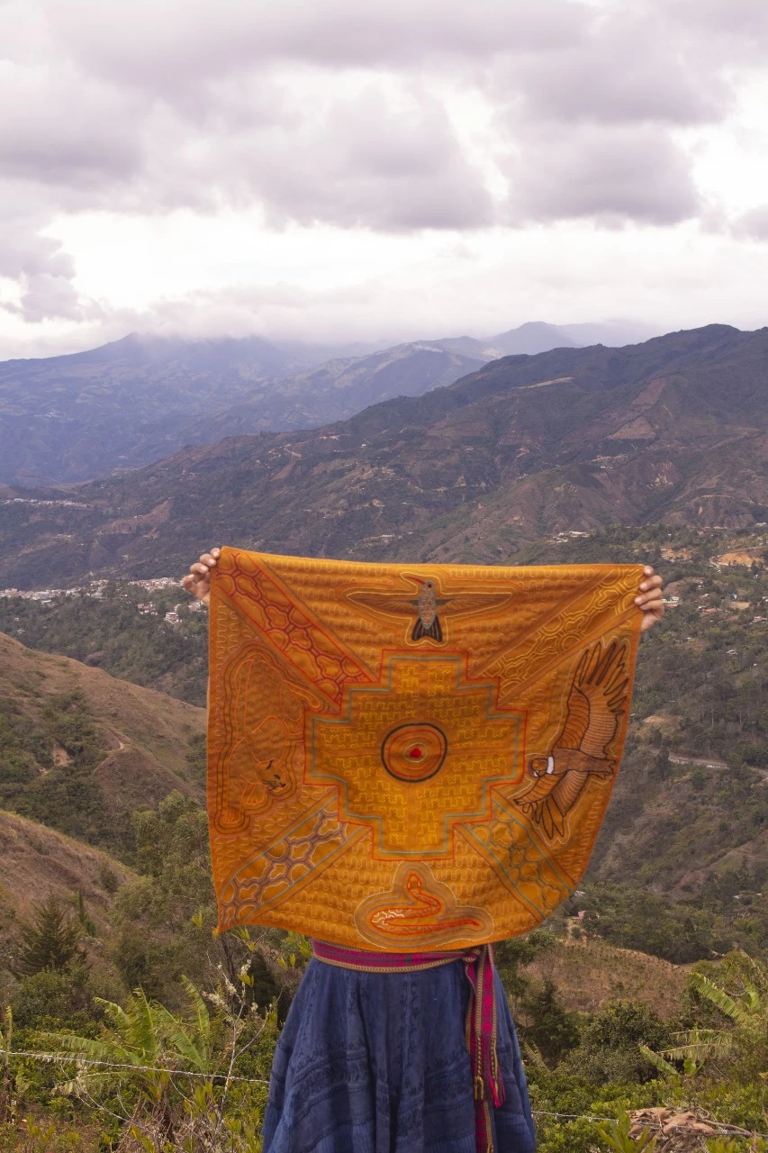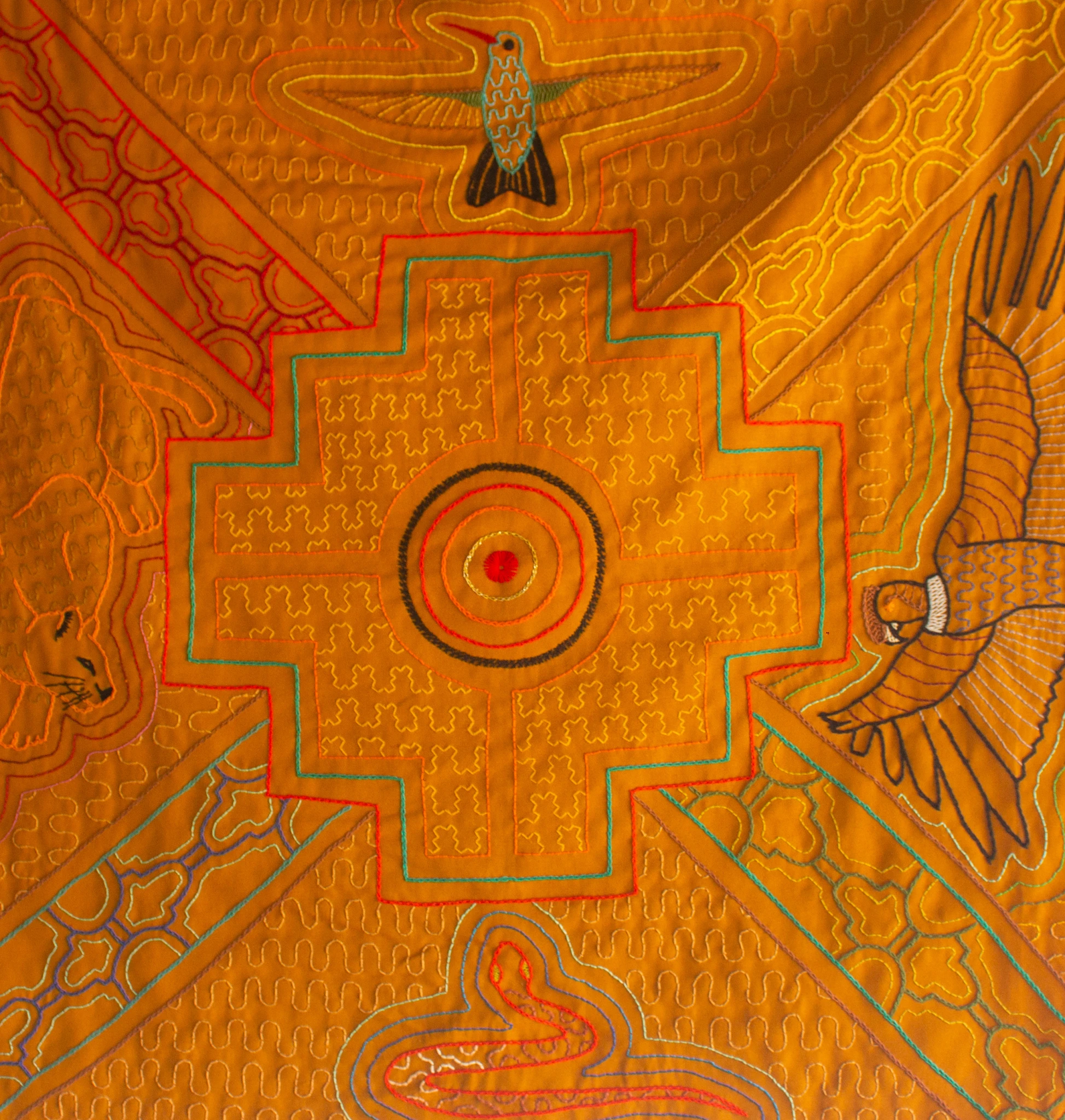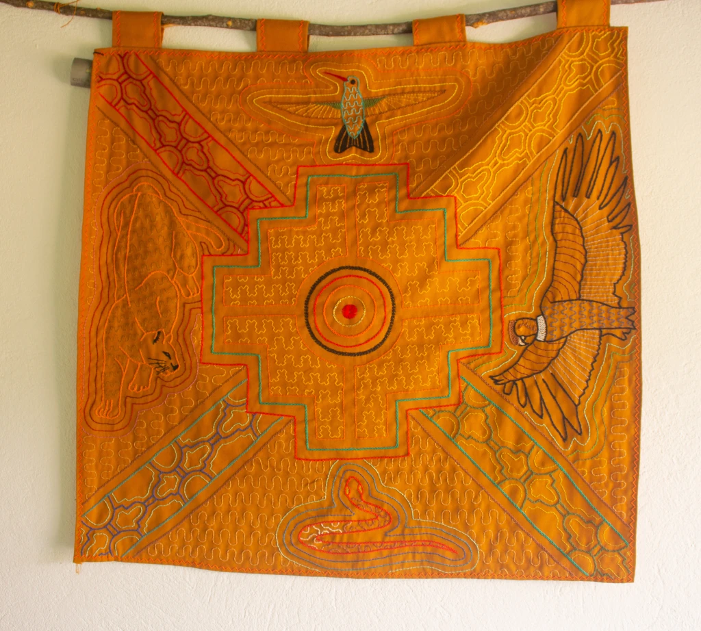 Este tapiz representa cantos medicinales sagrados (ícaros) . Este kene simboliza la chakana, que en quechua traduce "puente". Un portal para acceder a los caminos de las 4 direcciones, cada dirección está representada con un animal. La chakana es la que da claridad y enfoque en el curso de la existencia. Emite una hermosa vibración que favorece la sanación y la conexión espiritual, creando un espacio sagrado.
